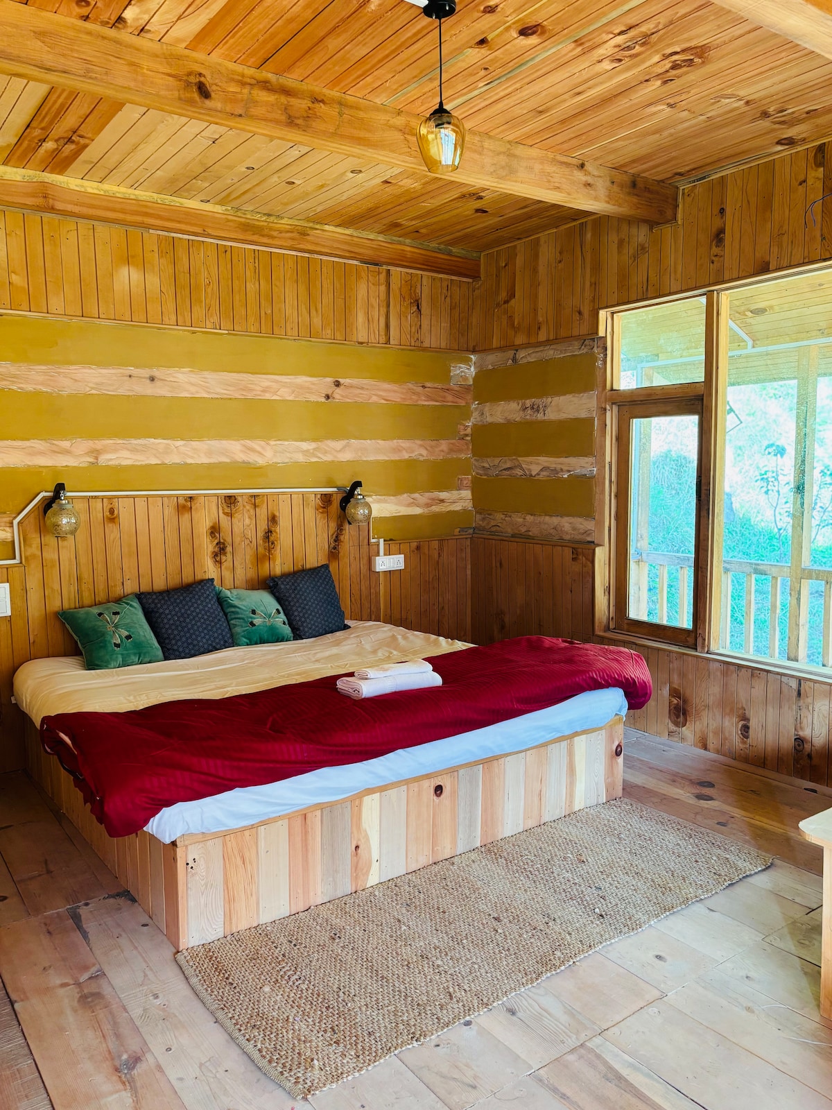 * Relax with the whole family at this peaceful place to stay. a wooden cottage in the middle of mountain with a spectacular view * there's a spacious bedroom, and an attic which function as a bedroom * bone fire 500/- * Broadband Wifi free * our cottage is in one of the most beautiful spots in the town. * Every single guest who stayed with us left happy. * there's a 700 meter trek, hut 99% of the young adults can make it.