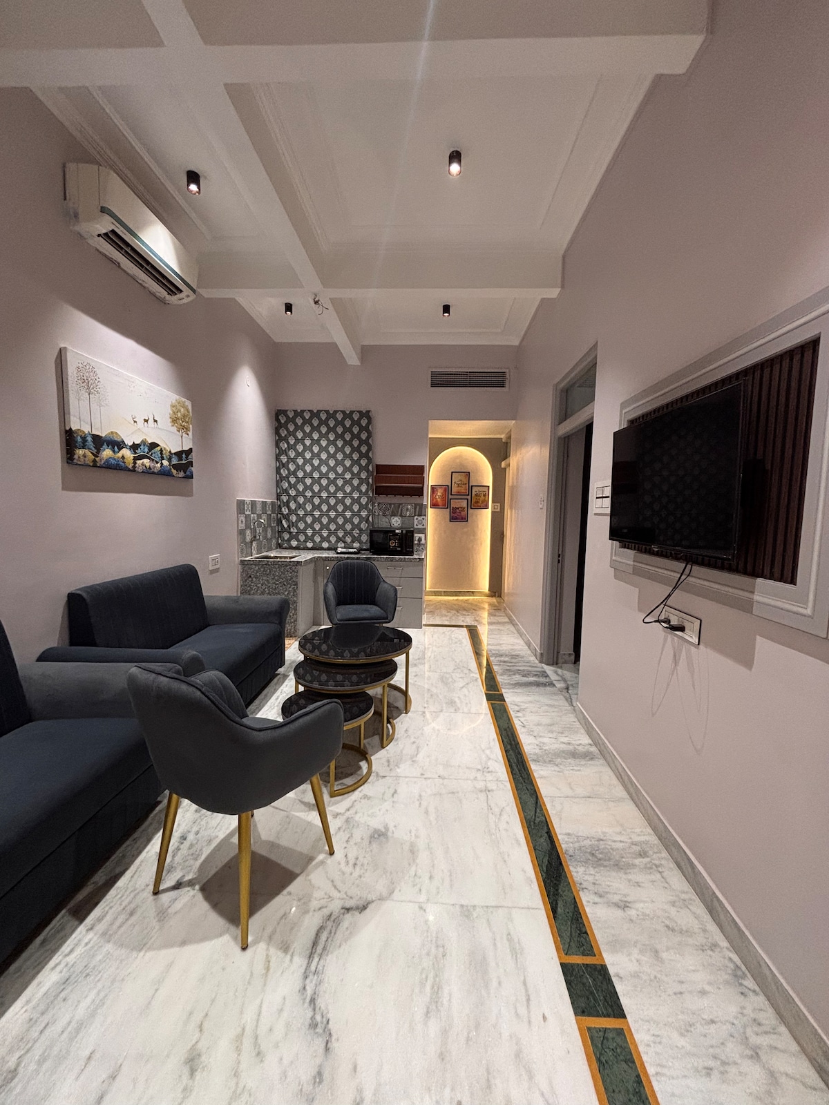 The Casa99 Premium Suite offers a luxurious and spacious retreat, featuring a comfortable bedroom. The suite is equipped with soft sofas for relaxation, an attached modern bathroom, and a fully equipped kitchen with essential appliances like a stovetop, fridge, and cookware. With elegant decor, ample space, natural light, complimentary Wi-Fi, and air conditioning, the Premium Suite ensures a refined and comfortable stay.