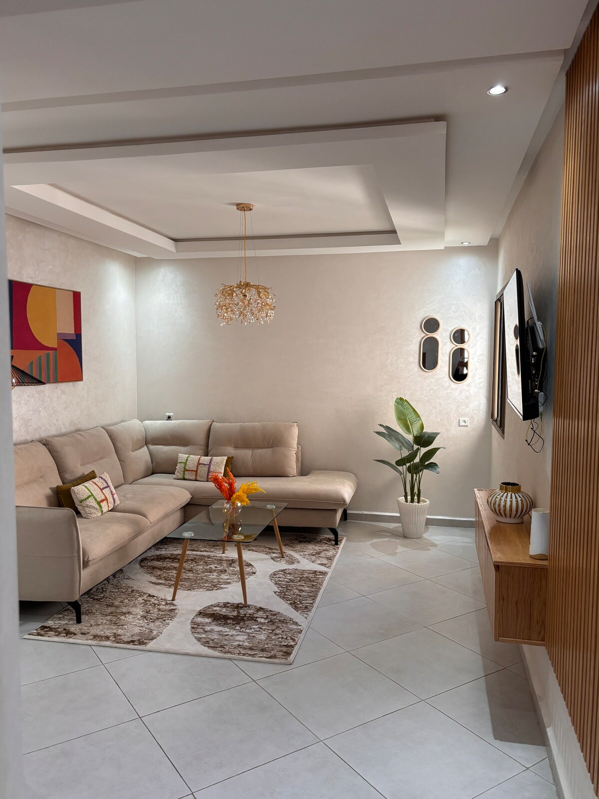 Studio cozy au cœur de Kénitra, dans un quartier calme et sécurisé à 5 min de la gare LGV. Situé au 1er étage (sans ascenseur). Idéal pour un séjour pro ou perso. Espace chaleureux et moderne avec Projecteur Cinéma, SmartTV (Netflix, IPTV), Jeux vidéo, internet fibre, Nespresso et thé à volonté. Cuisine équipée, salle de bain contemporaine. Self check-in simple pour un séjour en toute autonomie. Décoration luxieuse mêlant minimalisme et confort. À deux pas des cafés, restos et commerces.