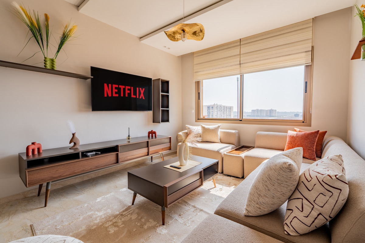 modern luxury studio with a cozy double bed, fully equipped kitchen, bright living area, bathroom, and access to an outdoor pool. Perfect for business or leisure. ✨ Returning travelers gift: free 15-min massage in a private VIP lounge at Casablanca or Marrakech airport , with Moroccan tea/coffee & pastries. ⭐ Key Features: 🛏 Luxury studio 📍 5 min from airport 🏊 Pool access 🍽 Kitchen ☀ Bright space 🔐 Secure & quiet 📶 FAST Wi-Fi & 55 pouce Smart TV & netflix 🚗 Parking