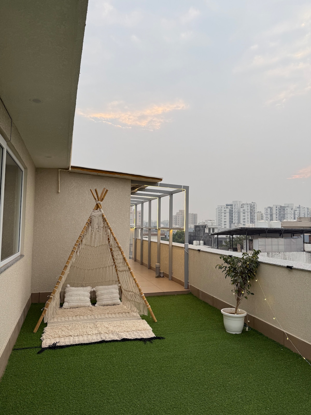 Nestled amidst the bustling Golf Course Road, yet offering a serene view of the Aravali forest range, this loft is a true urban oasis. Step into our spacious home with a living area, cozy dining area, and attached kitchen. Bedrooms offer rustic charm, comfy beds, ample storage, and access to peaceful terraces. A single bathroom is fully equipped. Enjoy views from two large terraces—one of the city and the other of the serene Aravali Forest, with a patio.