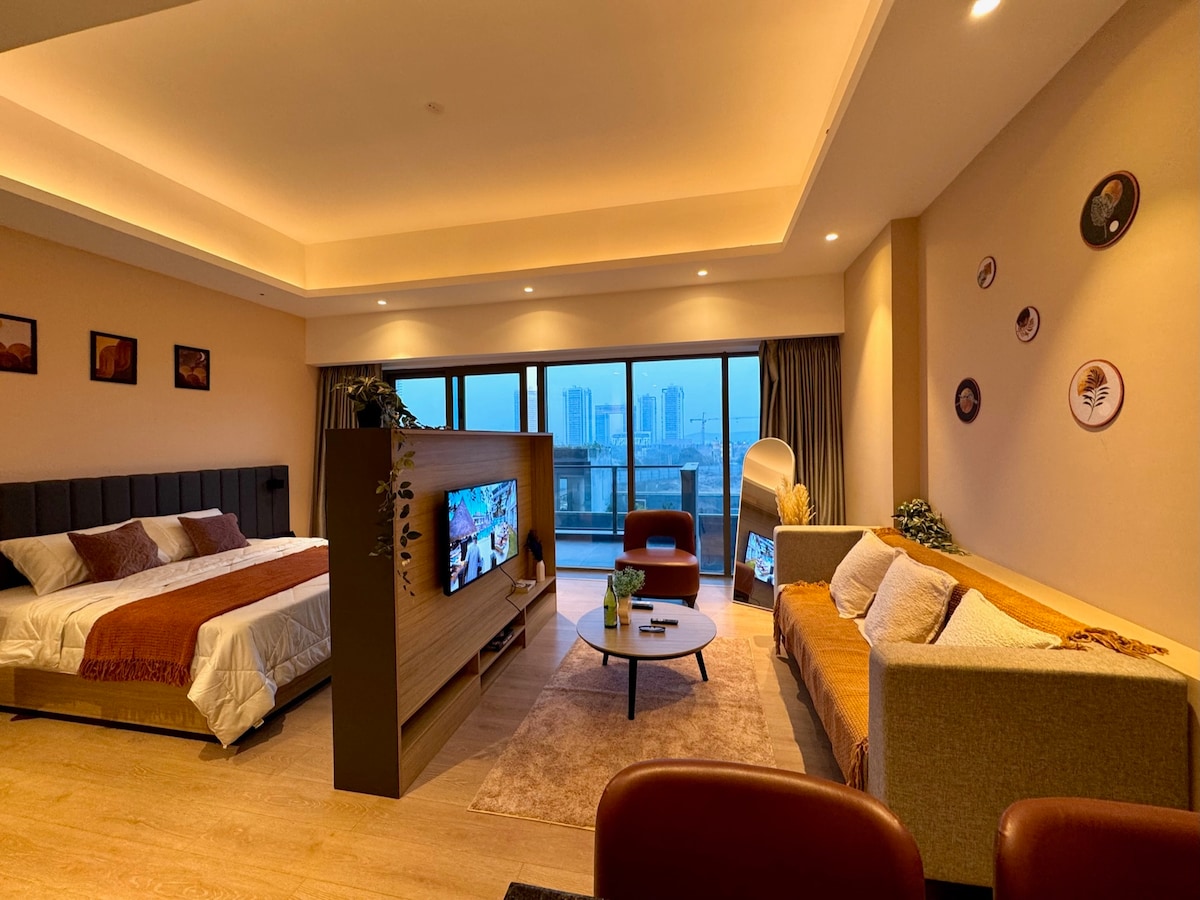 Welcome to our luxurious urban Studio, a sanctuary of style and sophistication in the vibrant heart of the Gurgaon. A standout feature of our loft is specialty Black color scheme, which adds a touch of elegance and drama to space, making your stay comfortable & stunning. As you step into our elegantly furnished Studio, you’ll be greeted by sight of our plush black recliners. These two luxurious recliners are the centerpiece, offering a perfect blend of contemporary design & exceptional comfort.