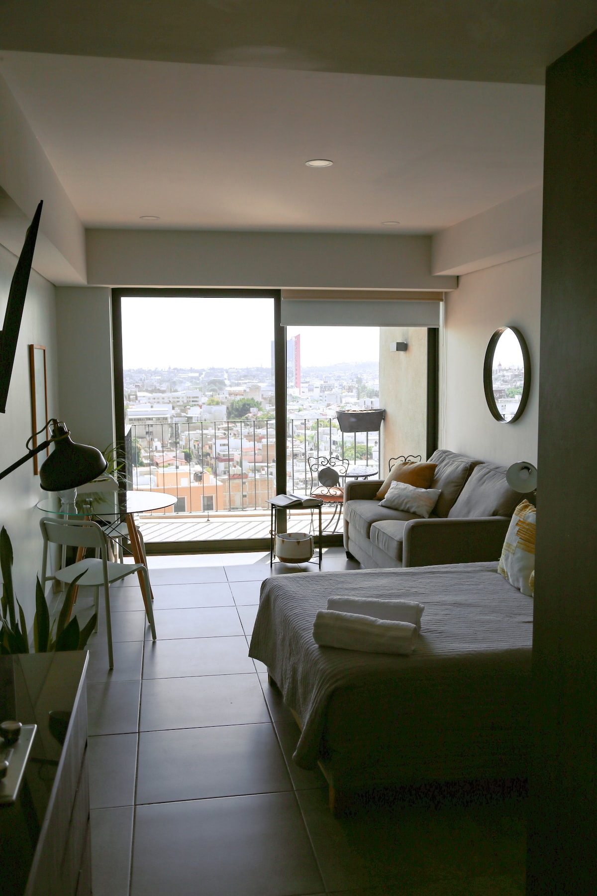 Refugio contemporáneo con terraza y vista elevada al skyline de León. Sala luminosa con Smart TV y acceso al balcón. Cocina integral equipada y comedor para 6. Suite con cama king y escritorio con luz natural. Baño en mármol con regadera y cancel. Vestidor amplio. Wi-Fi de alta velocidad, A/C y estacionamiento. Ideal para estancias ejecutivas y escapadas sofisticadas.