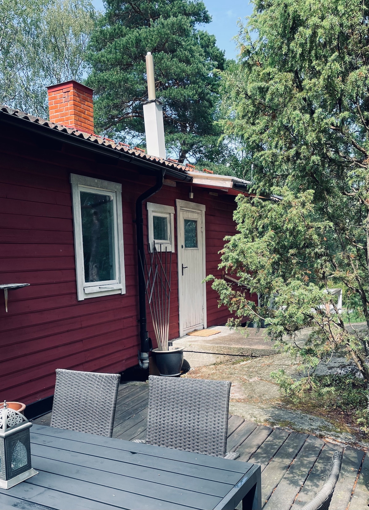 Lake cottage with wonderful seaside location, close to nature and walking paths. Sun all day. Smoke and pet free. Two bedrooms with door between. Suitable for 3 adults, or 2 adults and 2 children. Sauna with sea view inside the cabin. Shower and water toilet. Small kitchen with fridge, sink, induction stovetop with two burners and oven, microwave and freezer. Large terrace with sofa group and dining area. Chaise lounges are available as well as access to jetty and swimming area. WiFi. Possibility to come with your own boat. 10% discount for one week's rental.