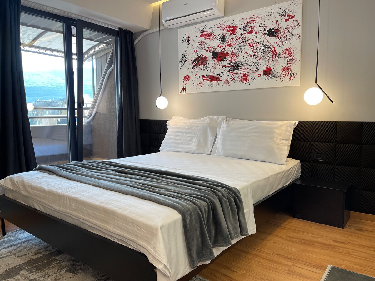 This luxury designed apartment is located in the heart of Skopje. The apartment is finely furnished and composed of a bright bedroom with a king ( twin )bed, a side kitchen equipped with full amenities and modern counter tops, and a comfortable bathroom with walk-in shower. The recently refurbished interior and overall décor give this apartment a trendy and sophisticated style.