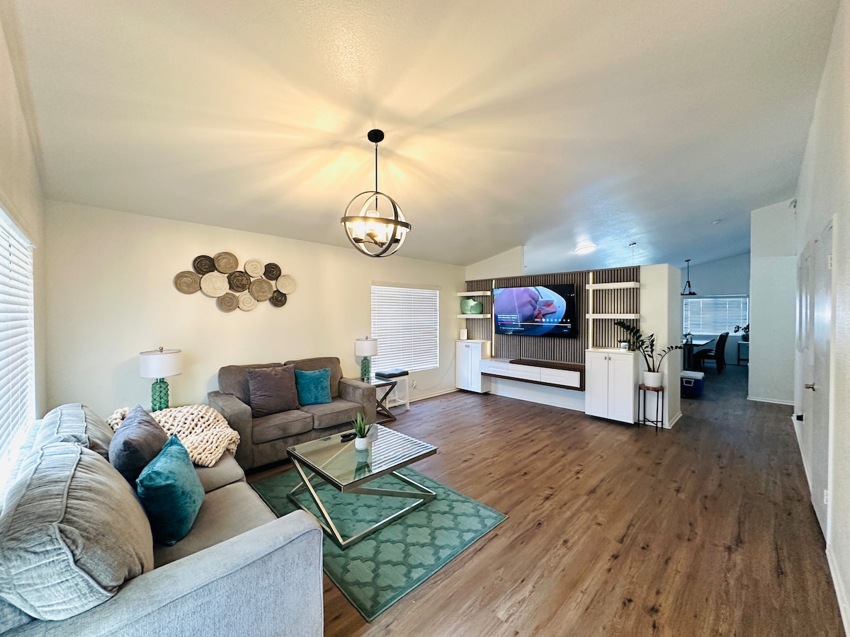 Kick back and relax in this calm, stylish space. This contemporary 1-bed, 1-bath, 1 pull out matress(sleeps 3) GEM on the 1st floor boasts nearly 900SQFT of stylish living space, with a convenient in-unit washer & dryer, & a fully stocked kitchenette with coffee bar. Immerse yourself in the vibrant community in the heart of Las Vegas, offering easy access to gas station, grocery store, & liquor store. * 15 min to Allegiant Stadium * 20 Min to Las Vegas Strip * 20 min to LV outlets shopping