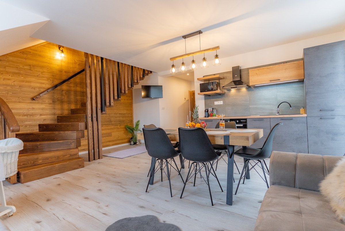 Apartmán Mezonet je vhodný pre 6 osôb. Ponúkame Vám moderný dizajn a možnosť využitia nášho wellness centra, ktorý je na objednávku
