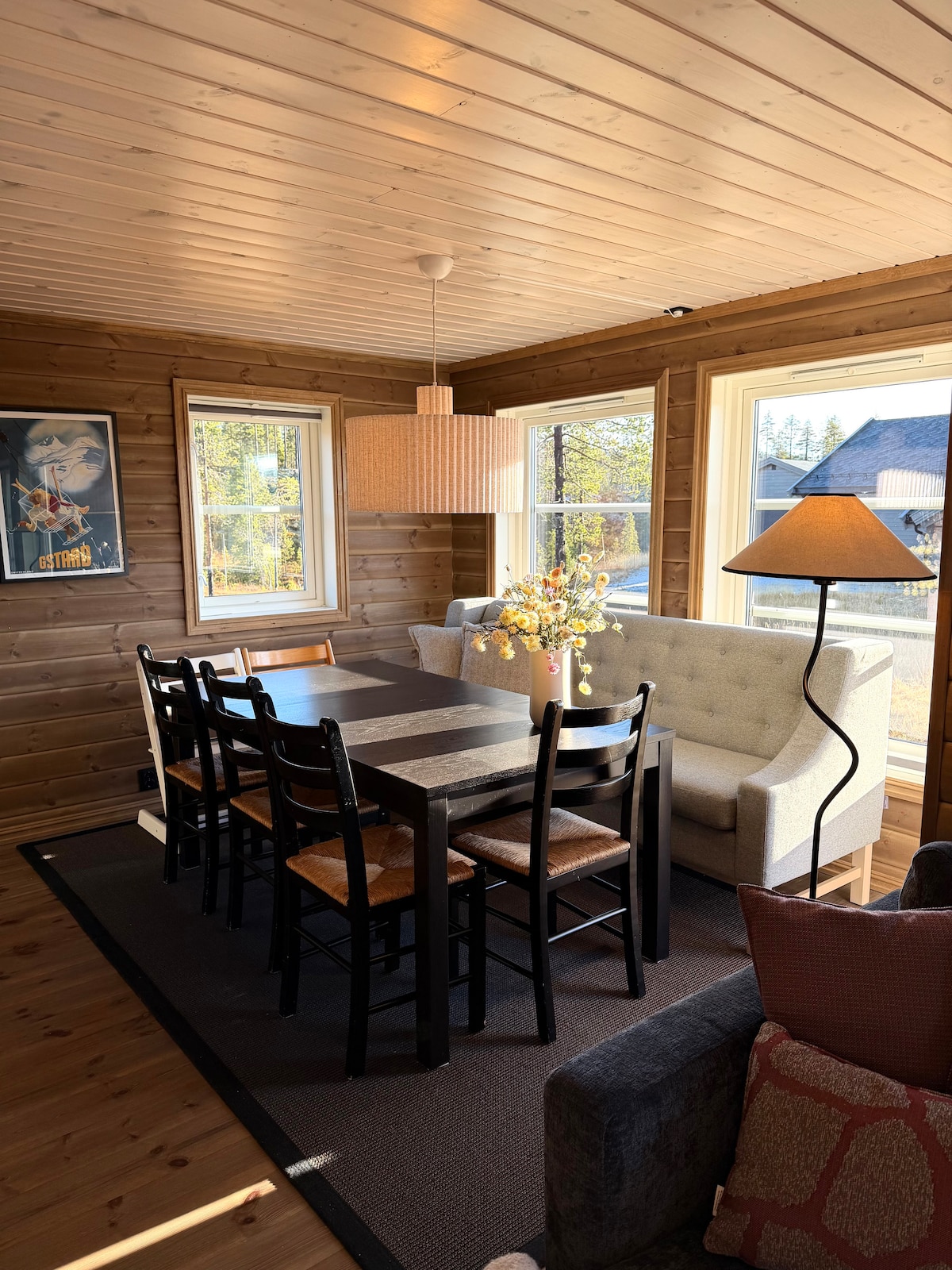 State-of-the-art cabin in the immediate vicinity of activities. 15 min from Bjørneparken. Cross-country trails outside and 5 min walk to alpine resort, cafe, pump track and bike park. 100m. from play area with tuftepark, zipline and barbecue area. Swimming water with jetty and rowboat and fishing opportunities nearby. 5 sleeping (11 beds) 2 bathrooms, 1 toilet and 2 living rooms. Kitchen with steam oven, microwave, coffee machine and large dining area. Renting to responsible persons, preferably over the age of 23. Partying and no pets allowed. Welcome!
