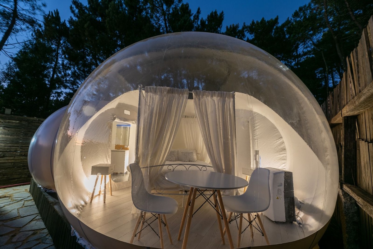 Imagine a magical corner in the middle of nature, where the starry sky is the ceiling of your room. A place with bubble suites, surrounded by mountains, forests, or a natural landscape that invites disconnection and rest. The bubble suites are designed to merge with the environment without sacrificing comfort. They are transparent spheres with a Balinese bed, soft sheets, and dim lighting that creates a cozy vibe. All suites include private bathroom and outdoor jacuzzi.