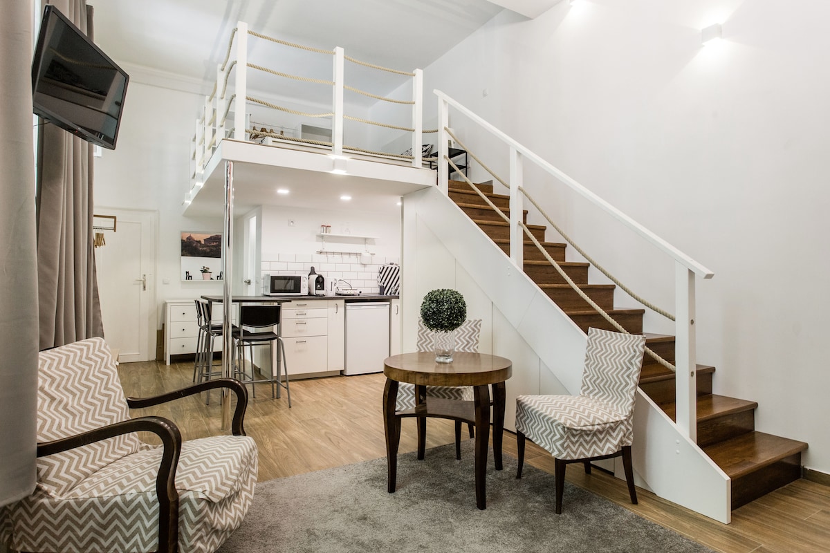 This cool, designer, AIR-CONDITIONED, loft studio, in the heart of the city centre, has been renovated to a high standard. Only 2minutes from Basilica, Opera, Bajcsy-Zsilinszky metro station and Andrássy út, 5mins from Deák tér, 8 mins from Parliament and Danube. Price included use of towels, bed-linen, coffee, tea, water filter, maps. The apartment has a code locked box for the keys, so you can come or leave late at night. Best choice for couples or single travellers.