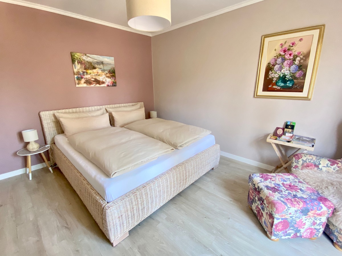 I rent a small cozy 1-room apartment with a separate entrance right in the center of town. At the top under the roof you will find a living room-bedroom with a small desk, armchairs and a 140 x 200 bed, a spacious bathroom and a kitchen. Bakeries, supermarkets and shops are in the immediate vicinity. The bedroom opens out to the garden and is so beautifully quiet. Stadthagen train station is a 20-minute walk. A bike can be rented on request.