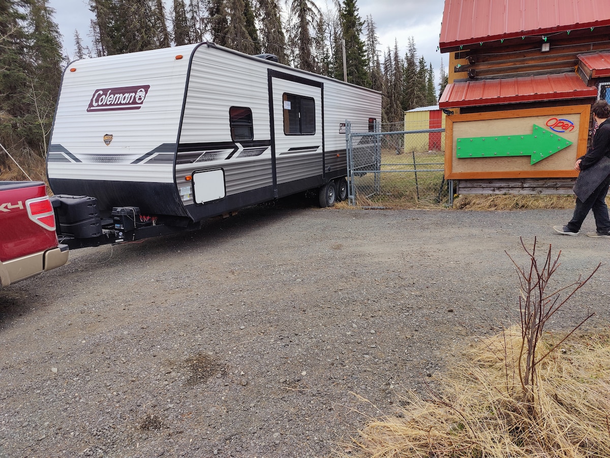 Like New, 30ft long trailer/slide that sleeps 4 adults with queen, hideabed and dining area for children. Private with parking, firepit and outdoor seating. Across the street from public access/boat launch to the Kenai River. One block away from public casting platform, bathrooms parking Moose Meadows. Walk across the street, catch and process your fish and ready for more. 3 miles behind Fred Meyer with access to shopping, gas, restaurants and facilities of Soldotna. Best access to town/River
