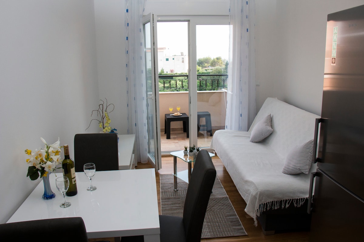 Our studio apartment is just next to the sea. The closest beach is only 2 minutes walk, while city beach is approximately 7 min walk. The interior is simple but cosy, with breathtaking view from the terrace wich gives you the 'sitting on the boat' experience. You have very good restaurant that works until 2 am, few shops and loads of caffe bars on approx. 7 minutes walk distance, old town of Split on approx 15 minutes by car (or 30 by local bus)