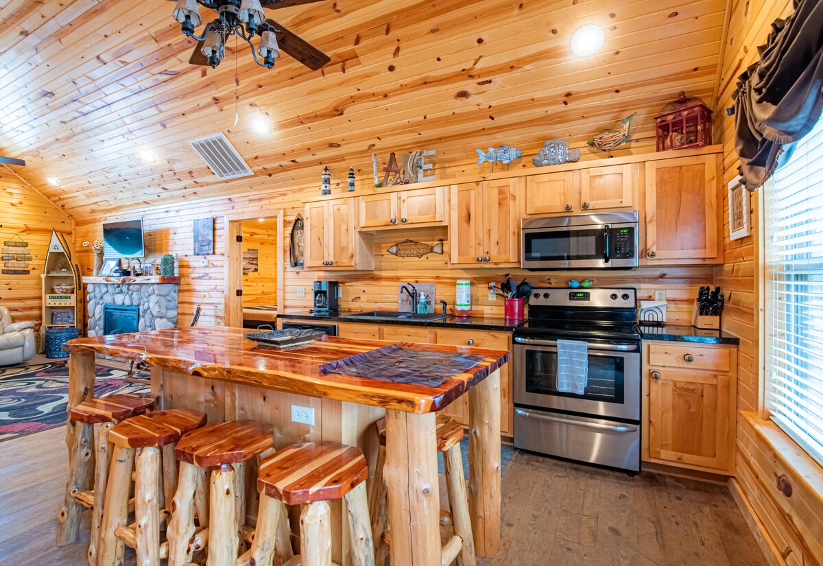 Unplug and unwind at The Cabin at the Cove. This cabin is the ultimate get away, from the covered porch, fire pit and wood stove, to the scenic views and cozy interior. This log cabin has tin roofs and will not disappoint. This cabin is off the beaten road, but don’t worry, it has all the modern amenities. There is access to a private cove less than a half mile away where you can drop a boat in, fish, and swim. There is no WiFi in this cabin.