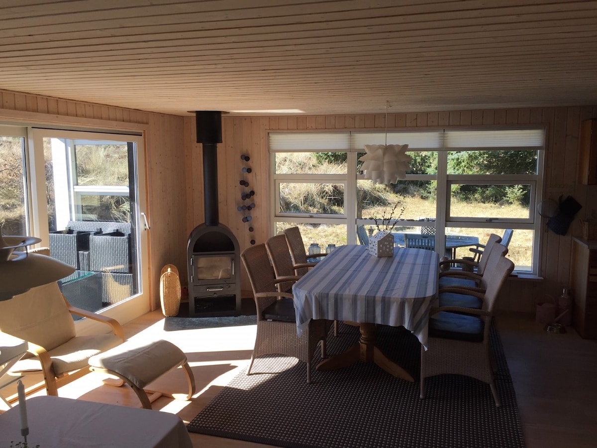 This spacious cottage is located in scenic surroundings 200m from the North Sea. Here is a west-facing terrace overlooking the water and protected heather hills and two other terraces, so there is the possibility of shade and sun. The house consists of a house with two bedrooms, living room, kitchen and bathroom, spa and sauna + space for four overnight guests. In the annex there are four beds and thus ideal for two families or two/three generations. Note: You must bring your own bed linen and towels