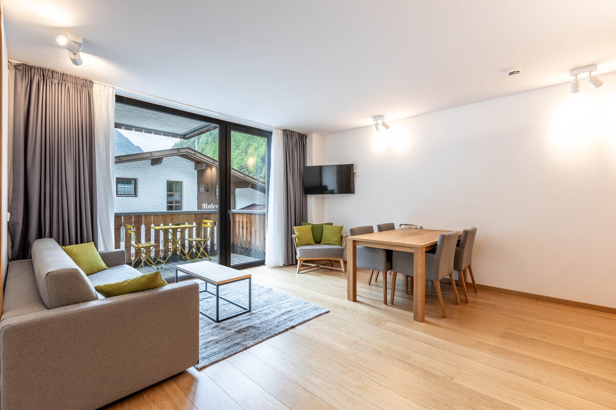 Studio for 1-3 guests - approx. 26-33 m² - with balcony or panoramic seating window and garage space ( €8,-/day) in the centre of Sölden. Kitchen with dishwasher, fridge, hob and microwave with oven function. Spacious shower, WC, Dyson hairdryer and hand and bath towels. A wellness bag with bathrobe for free use of the wellness area in our partner hotel opposite, yoga mat, rucksack for your adventures, Marshall loudspeaker, flat-screen TV and free Wi-Fi are also available.