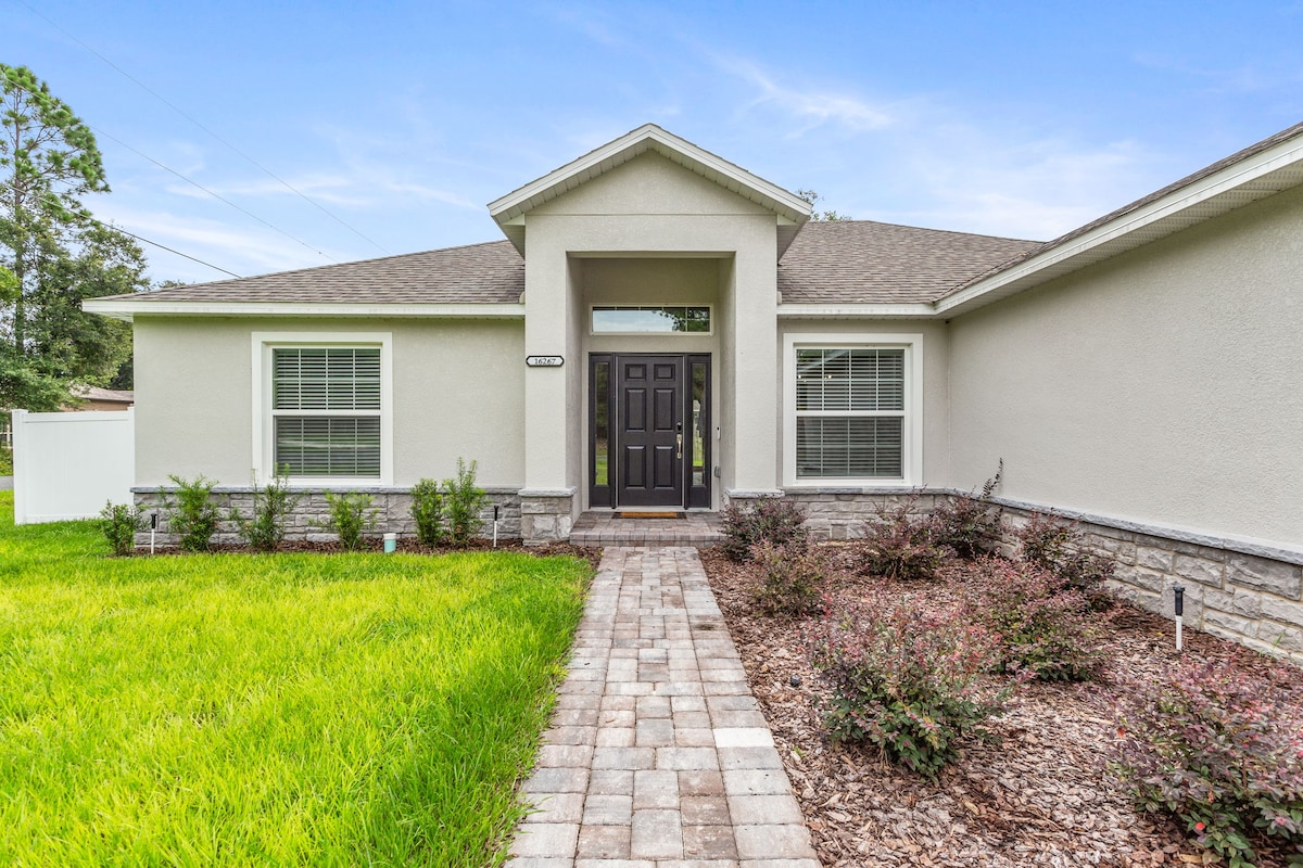 The Horsey Hideaway offers a brand-new, professionally decorated 4-bedroom, 2-bathroom home just 2 blocks to "The Villages ". and short drive to the World Equestrian Center! Features include: 4 Spacious Bedrooms -Luxurious primary king size bed /ensuite, 2 bedrooms - queen size beds and the fourth bedroom-twins. New Samsung smart TVs in each. Well-Equipped Kitchen with eat in dining Outdoor Fun: The fenced backyard, great for kids to play. A 7-person hot tub.. See rules on quite hours!