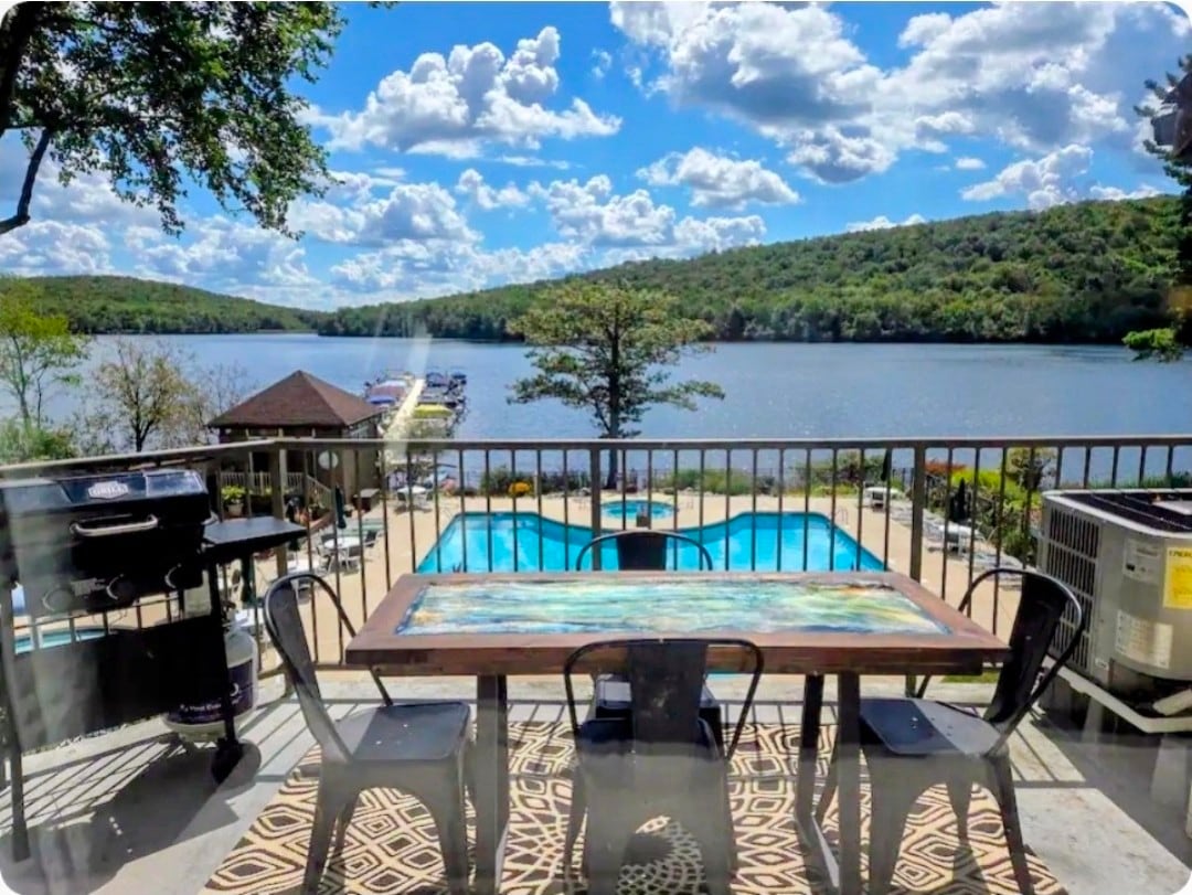 Chic Penthouse with an Ooh La La feel everywhere you gaze- stunning views. Best location at Midlake (Big Boulder Ski/beach), overlooking pool/ lake with cozy fireplace. Comfort abounds in every room. 4 season oasis - hiking, biking, zip line, Skiing, Beach, Pools/hot tub(summer), lakefront restaurants/bars, Jim Thorpe, wineries, Indoor water park, bowling, arcade, horseback riding, white water rafting, paint ball, outlets, casino - all with a secluded natural feel with lake and mountain view.