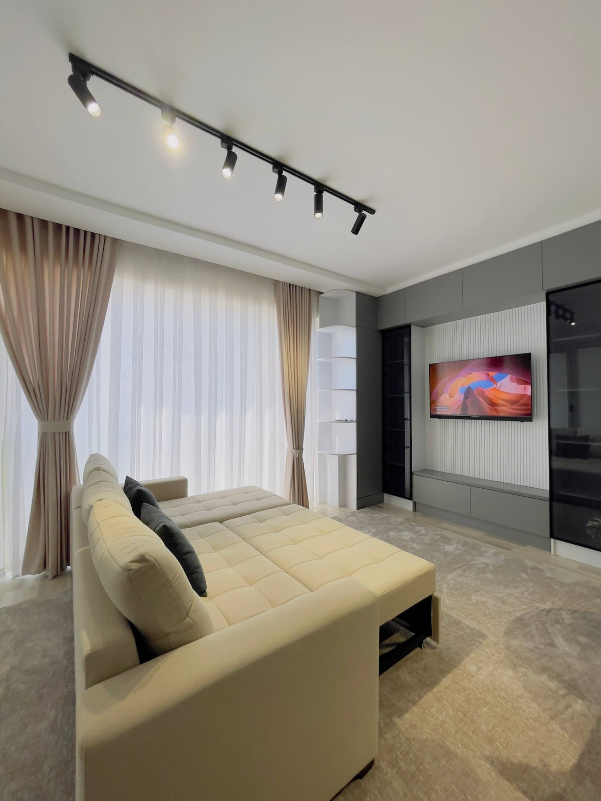 A refined retreat where style meets comfort. Floor-to-ceiling windows brighten the Scandinavian-inspired interior, with elegant furnishings and a fully equipped kitchen. Guests enjoy high-speed Wi-Fi, secure parking, a modern gym, and a rooftop terrace with stunning city views. Set in prestigious U-Tower with effortless access to the city center, it offers a truly elevated living experience.