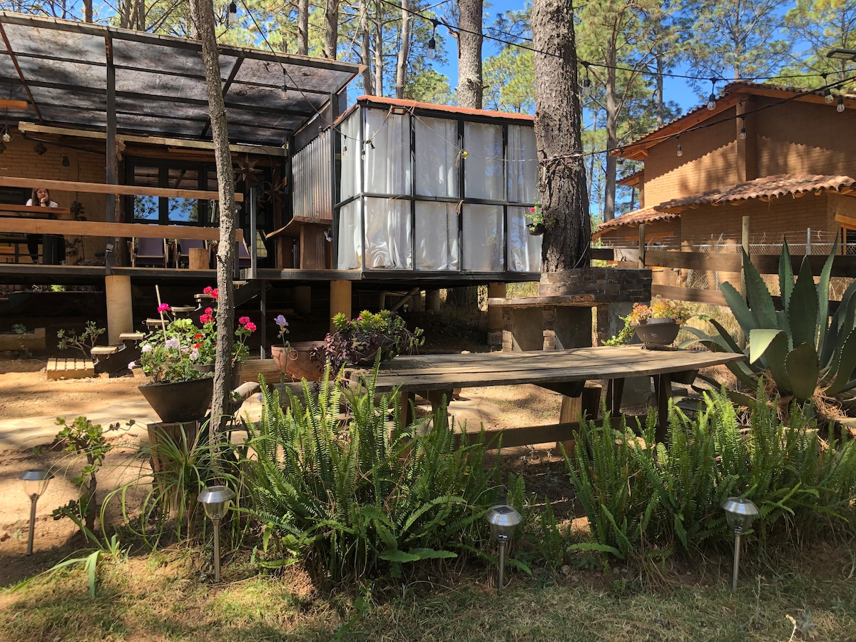 LAS FLORES CABIN 💮🌼🌻🏵️🌸🌺 Beautiful SUSTAINABLE cabin for 8 people located in the Sierra de Tapalpa, it 🌲 has a panoramic view from where you can see the Sayula lagoon, the Sierra del Tigre, various villages and the Tapalpa forest. - Paragliding a few meters away. - 7 minutes by road from the border, where you will find: Oxxo, gas station, restaurants, self-service stores, etc. - 15 minutes by road to Tapalpa, a magical village with countless tourist attractions