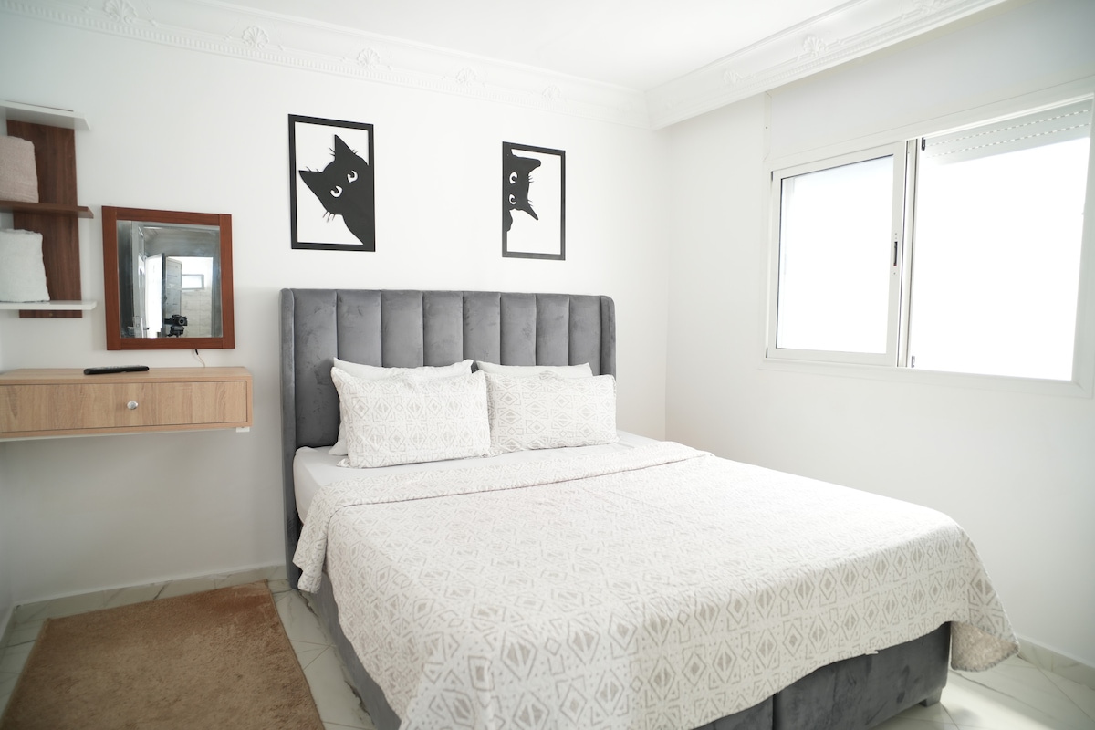 Welcome to your modern 2BR retreat in Salé—minutes from Rabat. Walk to train, tram and shops, with quick access to Rabat & the airport. Warm, light-filled interiors create a true home-away-from-home. Enjoy two cozy bedrooms, a bright lounge with 43” Smart TV, Netflix and fiber WiFi, plus a fully equipped kitchen. AC on request. Self check-in via smart lock in a calm, secure residence—ideal for couples, families or friends. Thoughtful touches for a stress-free stay—extra comfort and privacy.
