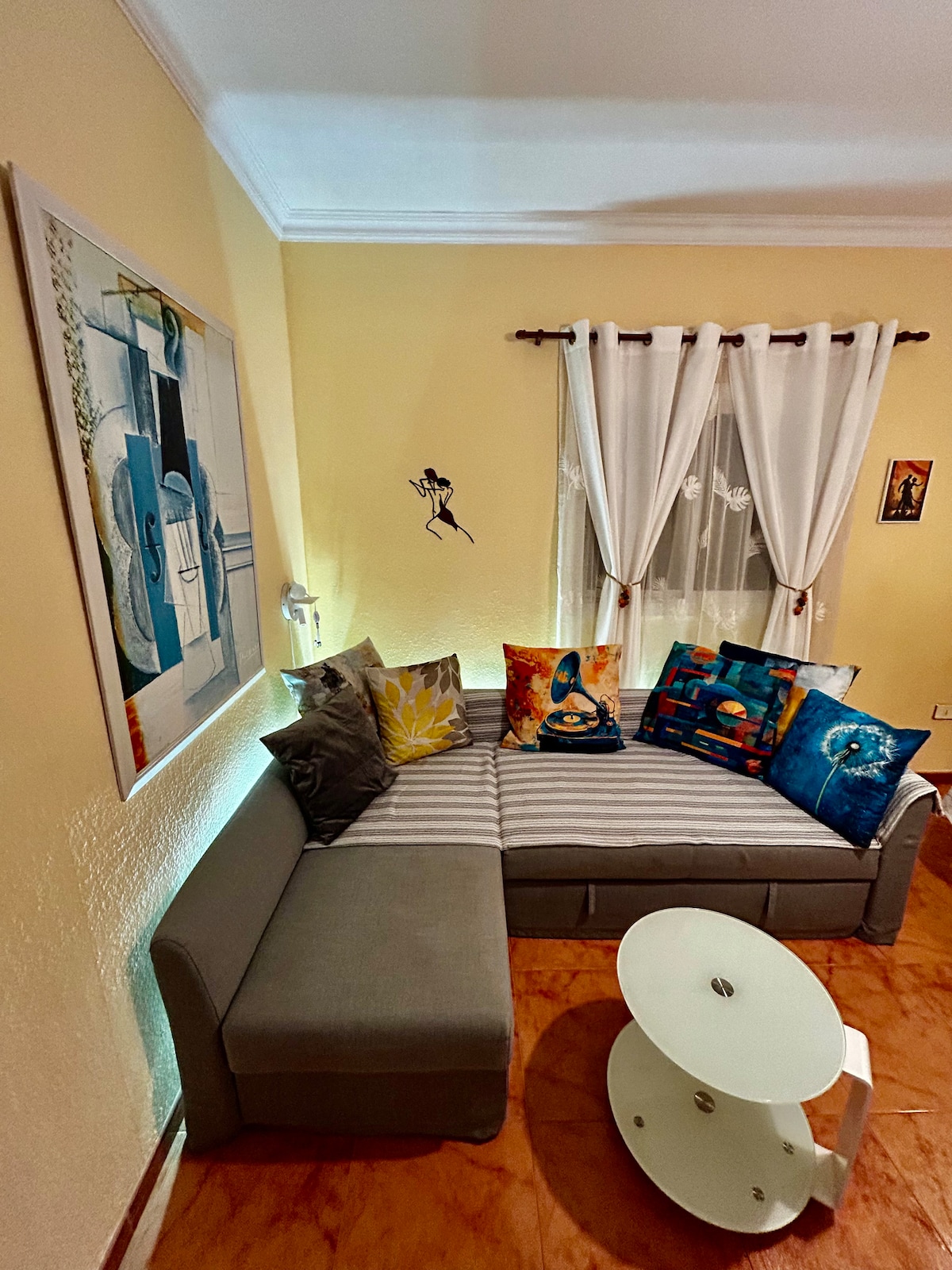 Trinimat holiday home by the sea Tenerife North No. 1, living room with sea view and sitting area, large TV, desk and 300 Mbit fiber optic internet, ideal for teleworking, bedroom with a 180 × 200 large bed, bathroom. Well equipped kitchen and WaMa, terrace with breathtaking sea view, private garden with shower and sun loungers. At the Airbnb final price, cleaning costs (60€) have to be paid for an additional weekly and are not included in the Airbnb final price.