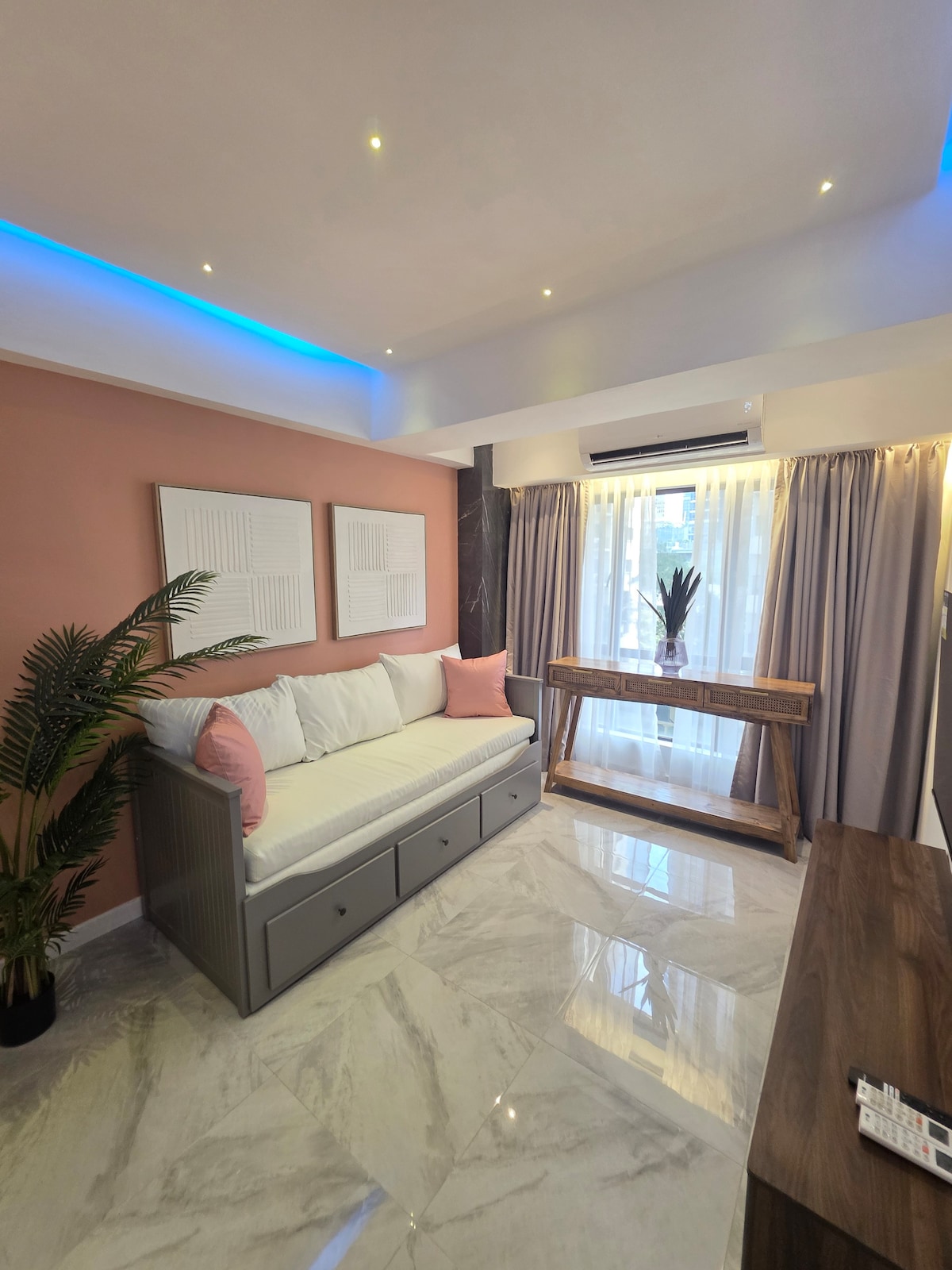 Fully renovated to high standards, large 48mยฒ / 516 sqft one bedroom apartment with balcony, in the middle of the best area of BGC. A XL desk is ideal for working too. Everything is modern and new and no expense was spared, Highspeed 200-330 Mbps Globe Fibr WiFi, a smart TV, LG air-conditioners, spot lighting, blackout hotel curtains, a large wardrobe, and a large queen size sofa bed for your guests. Unit faces the tennis court / courtyard.