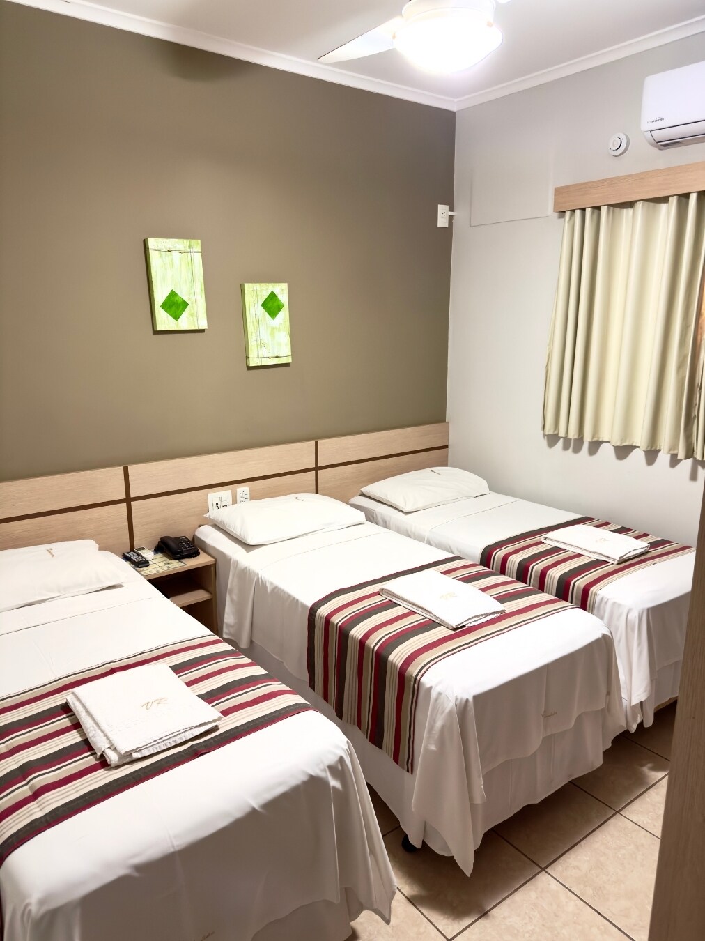 Perfect for those traveling with a companion and who do not want to give up a good rest. Cozy atmosphere, delicious beds and the ideal comfort to recharge after a day in the parks of Olímpia. With a double or two single box beds, cable TV, SPLIT air conditioning, high-speed Wi-Fi, minibar with snacks, heated shower, ceiling fan, landline, bath amenities, iron (request reception) and hair dryer (request reception).