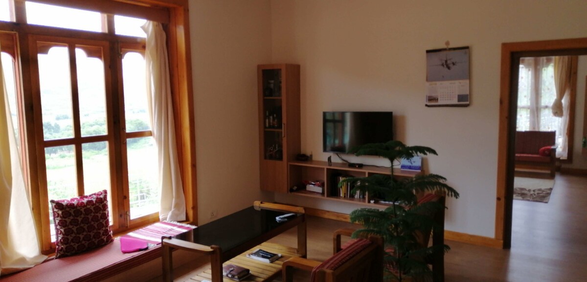 Yangkey Villa is a homestay with five spacious en-suite rooms each having contrasting ambience and magnificent view.The house has a huge living room with TV and a modular kitchen with open dining. We also have a dedicated laundry room. We are located just five minutes drive from Paro International Airport and sit adjacent to vast lands of paddy fields. We have our own vegetable garden including a green house and a large concrete parking for 15 vehicles. We also have a Barbecue for meat lovers.