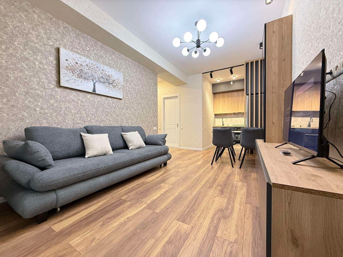Modern, cozy stay in a secure complex with a Smart Lock, full kitchen (Oven/Dishwasher), private Balcony with Mountain views, and home Cinema (Projector, Apple TV, Netflix, screen mirroring) Enjoy 2 seasonal Pools, a Robot vacuum, workspace & large Vitrage windows :) On-site: Parking, Spar, Fruit shops, Gym, Salon, Hookah lounge, Parks, Dog areas, Basketball courts, and a Car wash. Across: Ice rink & Gymnastics. Perfect for relaxing or remote work in Tbilisi with Fresh air and 100 Mbps Wifi.