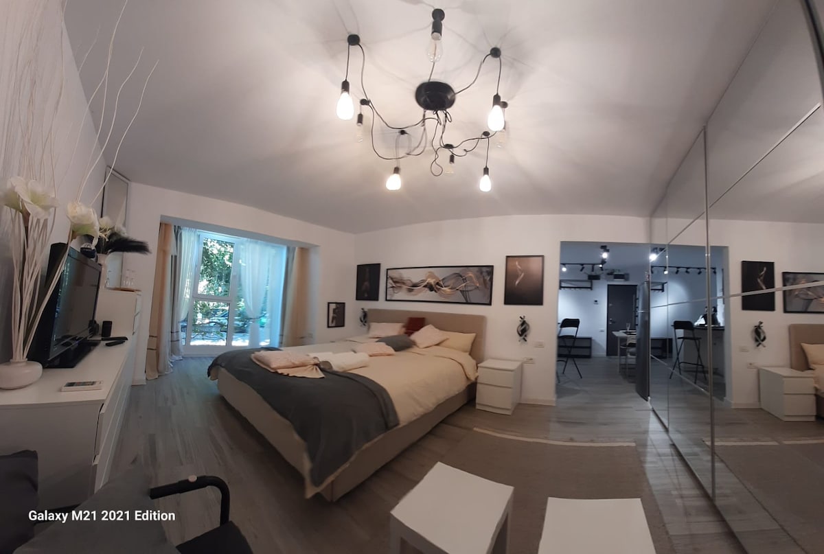 Welcome to our one-of-a-kind studio apartment close to the heart of the city. Our apartment got a grand mirror that not only adds depth to the room but also creates an illusion of boundless space. As you gaze upward, be mesmerized by the enchanting LED lights embedded in the ceiling, casting a gentle glow that sets the perfect ambiance for any occasion. These ceiling LEDs add a touch of sophistication and warmth to your experience. Promising an unforgettable urban retreat.