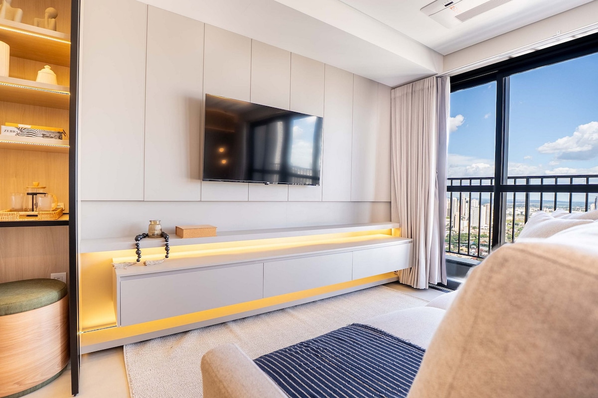 The Flat's architecture was designed by one of the most renowned professionals in Goiânia. The idea is for you to feel at home during your stay. Everything is automated; lights, curtains, TV, air-conditioning that offer comfort and refinement, just ask Alexa. Listen to music, watch more than 1,600 open and closed channels. Take a nice shower with a generous shower head. Take photos and relax on the balcony with a sensational sunset view and acrylic ceiling.
