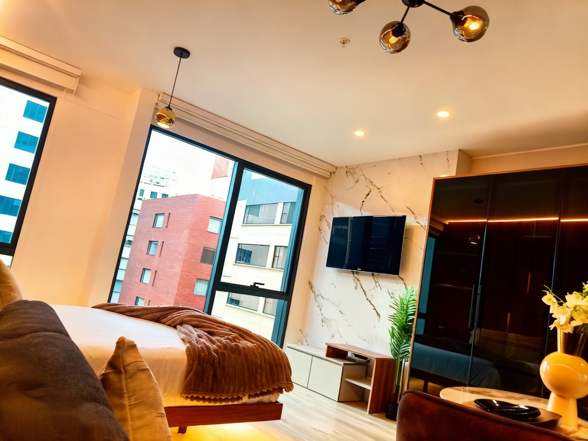 Enjoy the best location in Quito - a modern and cozy apartment in front of La Carolina park. Perfect for families, executives, and travelers looking for convenience and immediate access to the best of town such as restaurants, metro stop, and shopping malls. - Wi-Fi - Netflix - Disney+ - Iron -Fully equipped kitchen - Hair dryer - Washing machine and dryer - Hot water - Remote control curtains - Gym - Jacuzzi (reservation) - A cinema - Carrier