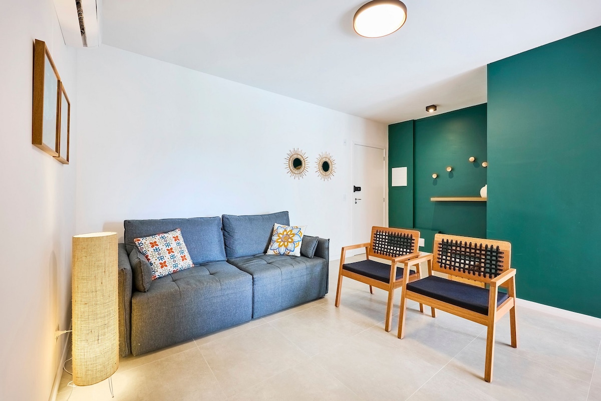 A high-end apartment in a brand new building, complete with wind-free air conditioning that makes no noise, in the bedrooms and living room, close to the main beaches, with a resort structure, and a few minutes from the center of Itaguá. Children up to 5 years old do not count, that is, they can come Pets are welcome