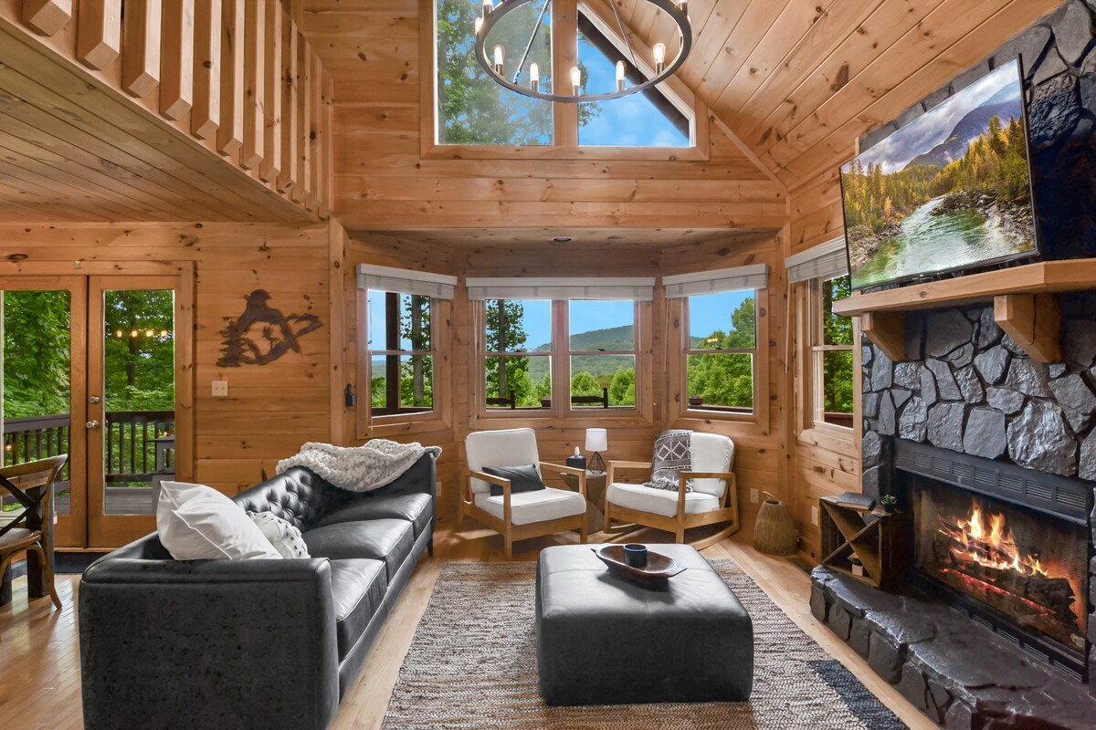 Retreat to the mountains and step into Cascading View Lodge where you will be greeted with incredible long-range mountain views. This luxury cabin is <20 min from downtown Blue Ridge. Come take in the mountain views on our screened in porch and spacious deck. We offer a fire pit underneath the stars and hot tub to enjoy with family and friends! For your comfort we offer 5 smart TVs, high speed WiFi, game room with arcade game and more, and a fully stocked kitchen! Let us help you plan your trip!