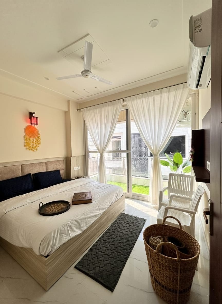 A peaceful yoga-inspired stay in Tapovan, Rishikesh, designed for calm, balance, and mindful living. Featuring a dedicated floor-based yoga & meditation space, natural textures, warm lighting, and a soothing layout that helps you slow down and reset. Ideal for yogis, solo travelers, couples, and spiritual seekers looking for a quiet retreat near yoga schools, cafés, and nature. A soulful stay where you rest, breathe, and reconnect.