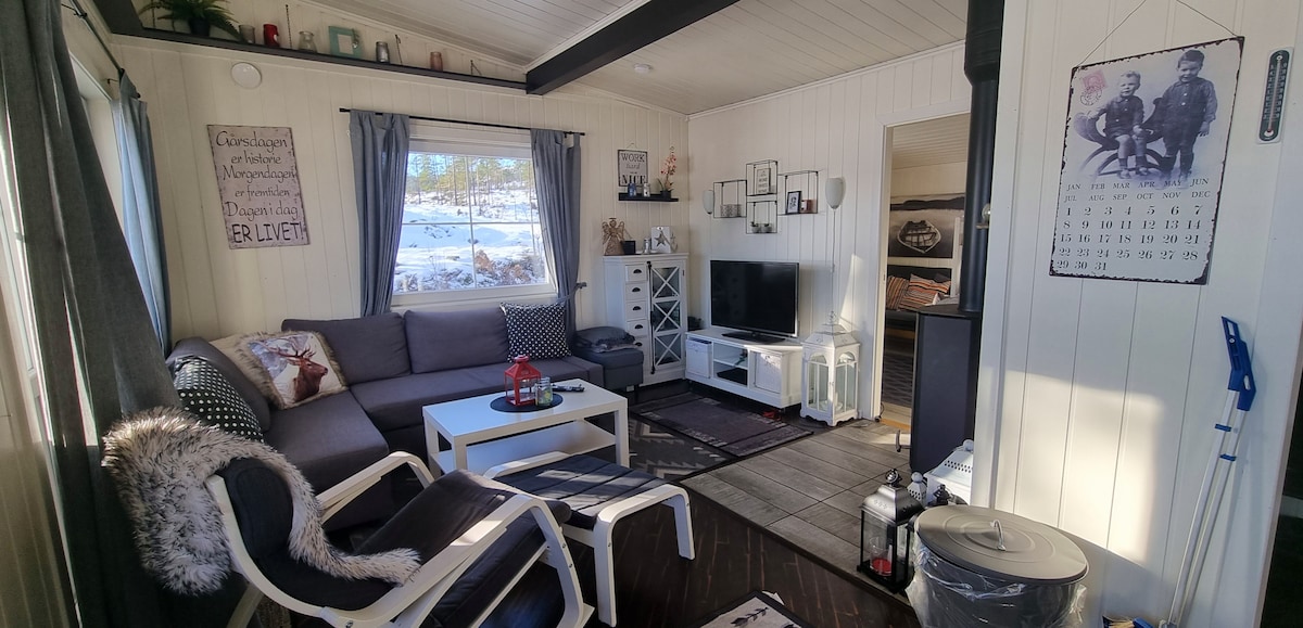 Cozy inland cabin with good hiking possibilities in the fields of summer and winter. Ski slope in nearby, 300m. Good fishing opportunities 500m. Covered terrace with outdoor furniture and fire pit. Great opportunities to see moose, deer and deer from the cabin. Awesome sandy beach, 5 minute drive. Distances. Kristiansand Zoo. 55 minutes. Kristiansand. 40 minutes Vennesla 25 minutes Evje 25 min Mandal 55 min