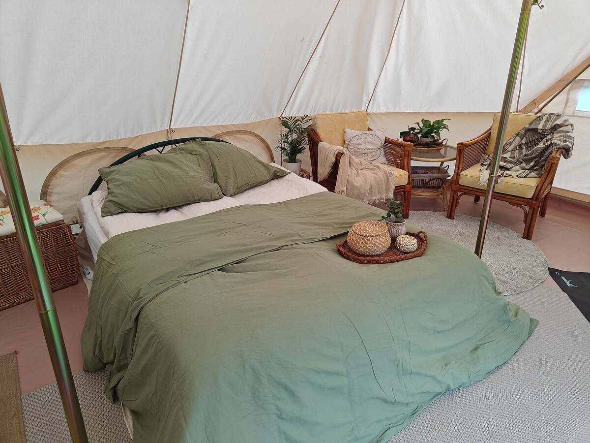 Glamping with Alpacas – Luxury Tent in the Countryside Enjoy the peace and quiet in a luxury tent out in the countryside – right in the middle of an alpaca field! This is a unique overnight stay with a wood-burning stove, cozy decor, and the chance to get up close with our curious alpacas. Perfect for couples, friends, or families looking to unwind and experience something truly special. Welcome to a unique glamping experience – where you'll spend the night together with our four alpacas.