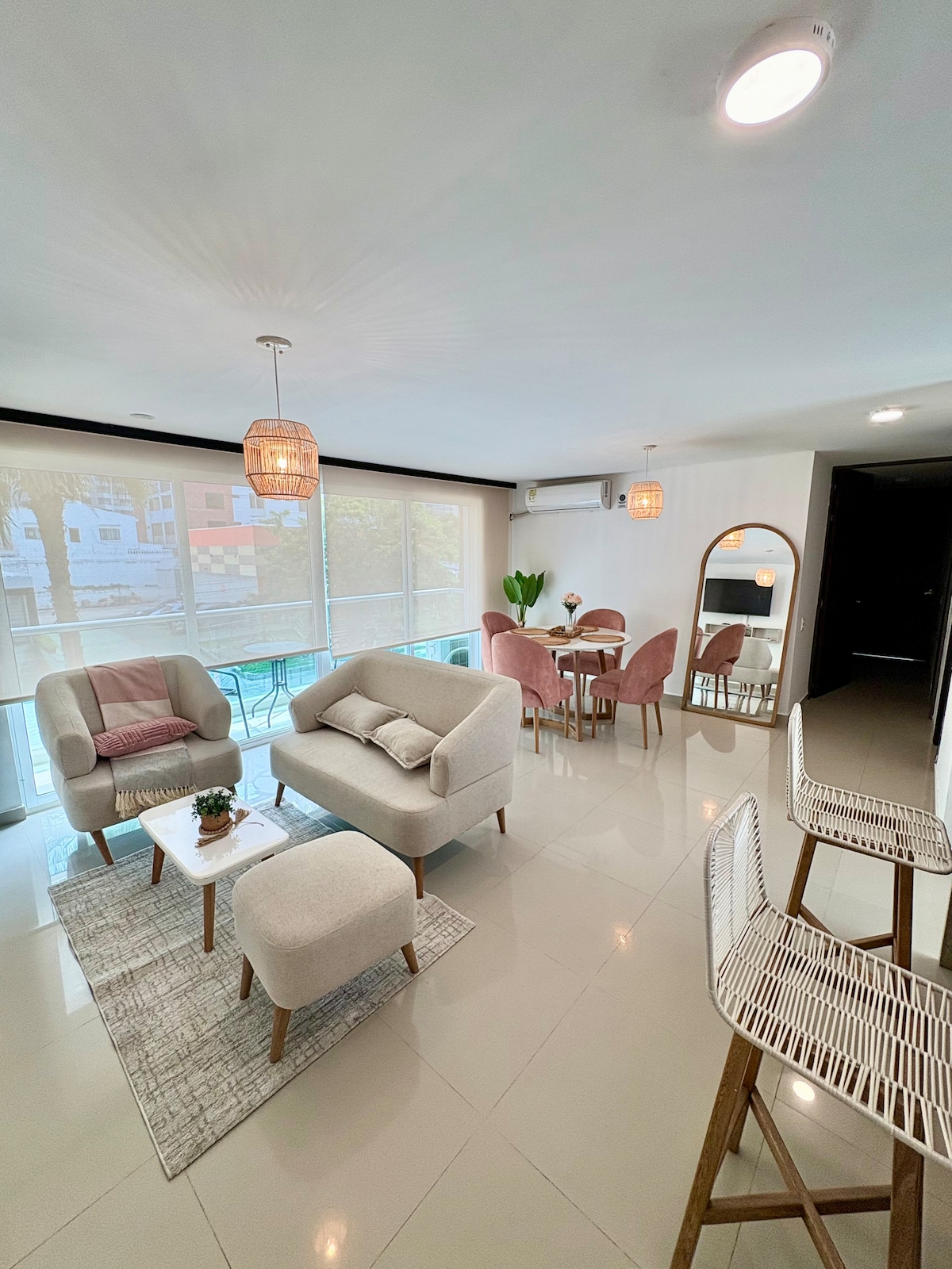 Modern apartment located in one of the most exclusive neighborhoods in Barranquilla. *Flexible check-in and check-out *1 bedroom with queen size bed and air conditioning. *Living room with sofa bed and air conditioning. *Fully equipped kitchen with utensils, basic appliances and washing machine. *Swimming pool, sauna, Turkish bath and rooftop terrace. *Smartfit gym nearby. *Free private parking. *Close to VIVA and Buenavista shopping centers, and to the main clinics and tourist areas.