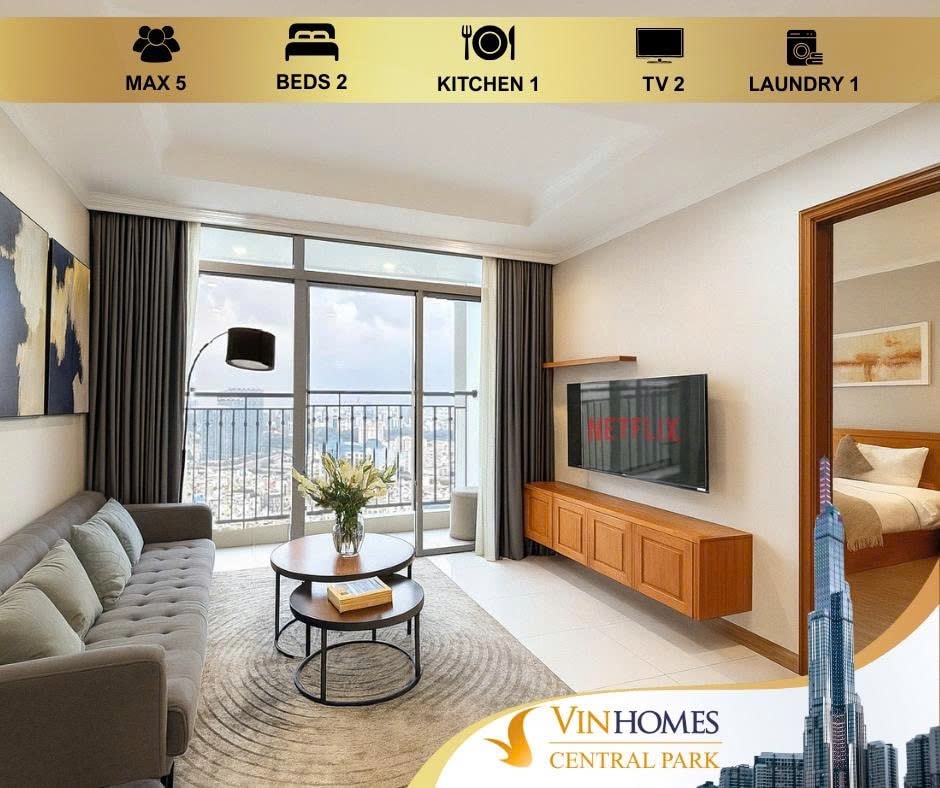 Welcome to your stylish home in the heart of Vinhomes Central Park, one of the most luxurious residences in Ho Chi Minh City. Perfect for families, couples, or business travelers. 🛋 Apartment Features • 2 cozy bedrooms with queen beds & fresh linens • 2 bathrooms with hot water & full amenities • Bright living room with sofa & Smart TV (Netflix available) • Fully equipped kitchen (fridge, stove, microwave, cookware) • Washing machine, air-conditioning & high-speed WiFi
