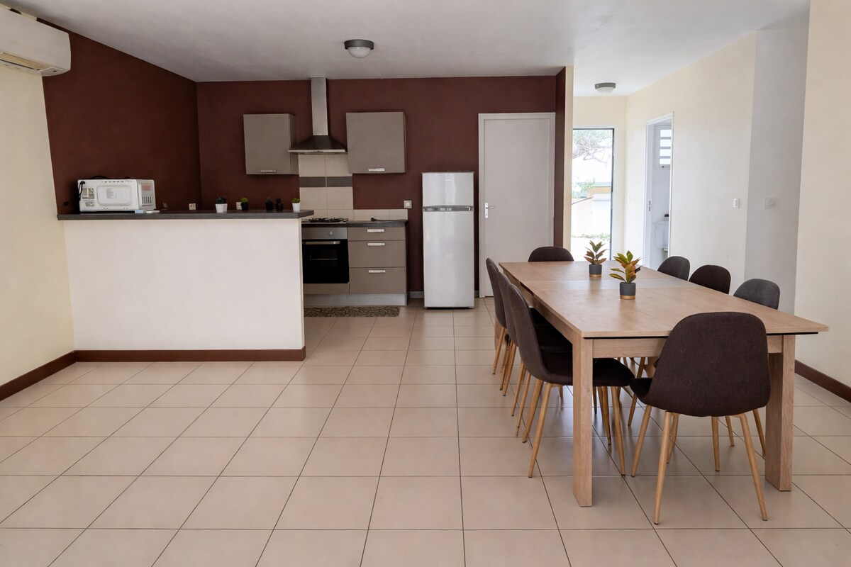 Villa F6 spacieuse et lumineuse située dans le lotissement de Bellevue. Idéale pour familles, groupes ou séjours professionnels. Grand séjour ouvert sur une terrasse couverte et un jardin arboré, cuisine équipée, 5 chambres climatisées avec rangements accessibles selon le nombre de voyageurs, salles d’eau fonctionnelles et WC séparés. Buanderie avec pompe à chaleur, lave-linge et congélateur. Stationnement facile.