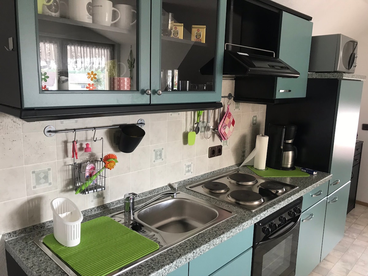 Welcome to Wetterburg, in our newly renovated and lovingly furnished 1-room apartment. It can accommodate 2 people in 28 square meters. Bedroom with double bed (individually adjustable), TV and desk. Well-equipped kitchenette, bright bathroom with walk-in shower, sink and toilet. The Twistesee invites you to swim and with its approximately 7 km long car-free circular path also to hike and cycle. The Baroque town of Bad Arolsen is 4 km away.