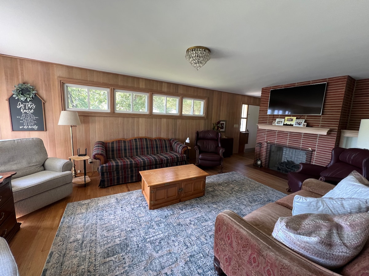 Relax at this cozy Cabin located across from the River Trail and right off I-74. Enjoy the wrap-around balcony, the privacy and tranquility of this beautiful place. Kids can stay in the loft w/ a reading nook and smart TV. Private master bedroom w/ touch lamps. Great location, close to everything. Large side lot with plenty of room for outdoor activities, including a fire pit. In-law quarters on the lower level w/ kitchenette, bathroom and queen bed upon request.