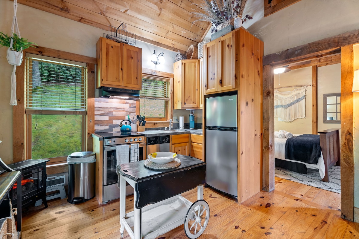 🌿 This handcrafted tiny house is designed for couples seeking a romantic, peaceful retreat. 🛏️ Queen bed, full bath, and cozy living space with vaulted ceiling. 🍳 Fully stocked kitchen. 🔥 Private firepit deck with Adirondack chairs. 🪵 Covered porch with a grill, and seating. 🏞️ Minutes to Boone, Blowing Rock, Banner Elk, Grandfather Mountain & hiking trails. 💑 Designed for peace, connection & quiet adventure🕯️ Tranquil, creative, and close to everything—without feeling close to anything.