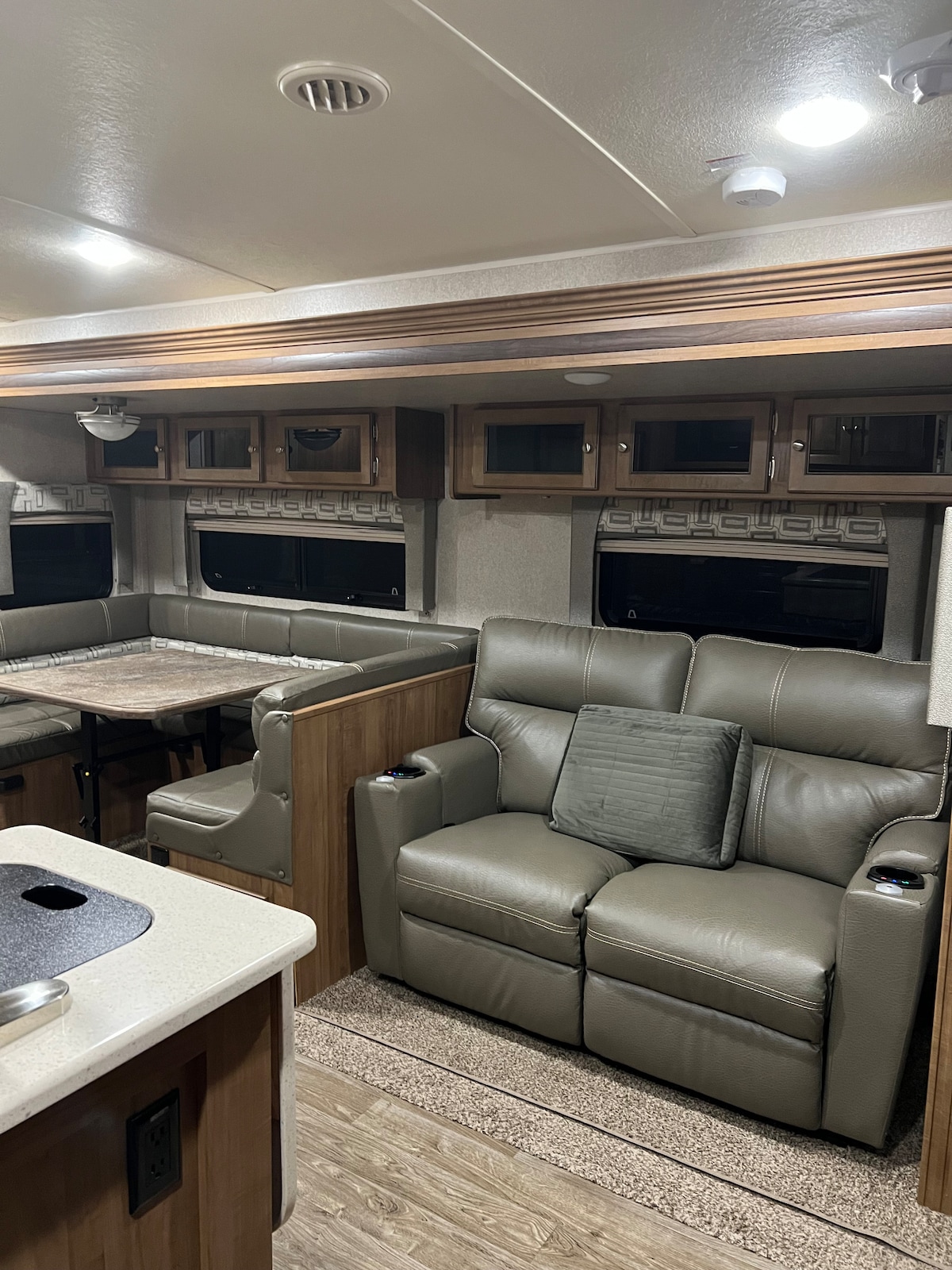 Perfect for 1-2 guests-but also enough room for up to 7. Large 34 ft RV. Sleeps up to 7 comfortably. NOTE: This camper is located on our approx 1 acre property at the end of our blacktop driveway- beside the home. It has a Queen Master Bedroom with slide out closet storage/TV. Bunkhouse w TV can sleep 4-5 easily. 2 Reclining/Heated/Massage chairs. Large dining seating area-Large TV/DVD Player. Full kitchen/ Microwave/Fridge-Freezer/Oven. Outdoor kitchen area is Not for Guest use. POOL 8am-10pm