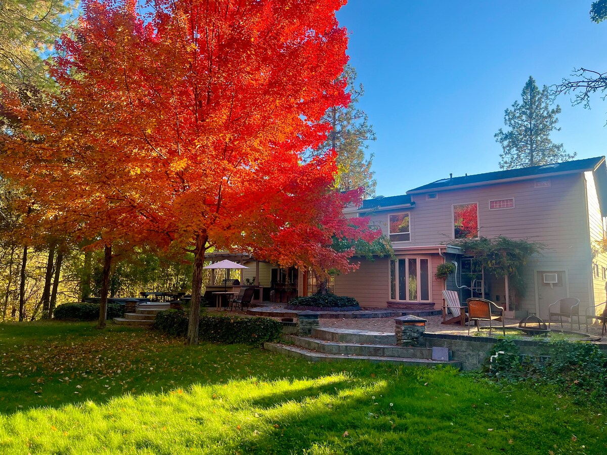Secluded forest of 5 acres only 3.5mi to Grants Pass with a private trail into legendary Cathedral Hills. A 3/2 home with DSL Wifi, dining area, living room, pellet stove, a fun converted carport for dining/entertainment/BBQ as well as a hot tub out back. Property has a seasonal creek and pond, a safe 300' from the house, and a classic tree fort. Enjoy outdoor dining, hiking, biking, or relaxing in the quiet southern Oregon woods. We are pet friendly, require a $30 per pet fee, and limit 2