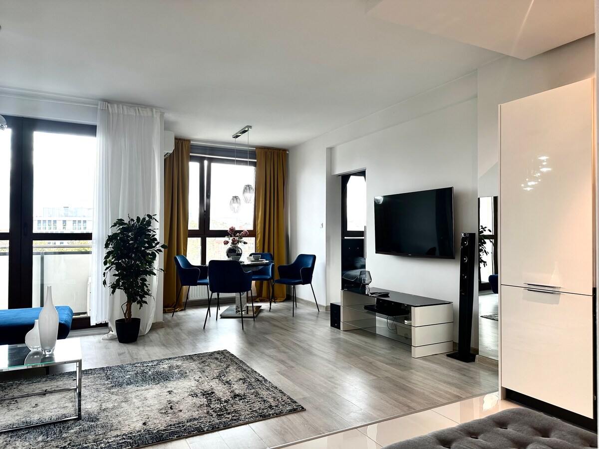 Luxury apartment with two separate bedrooms, a spacious living room, and a large balcony overlooking the Oder River. A fully equipped kitchenette, sofa bed, SMART TV, and elegant bathroom ensure a comfortable stay. Located in the center of Wrocław, close to public transport, cafés, and restaurants, it allows you to enjoy the very best the city has to offer.