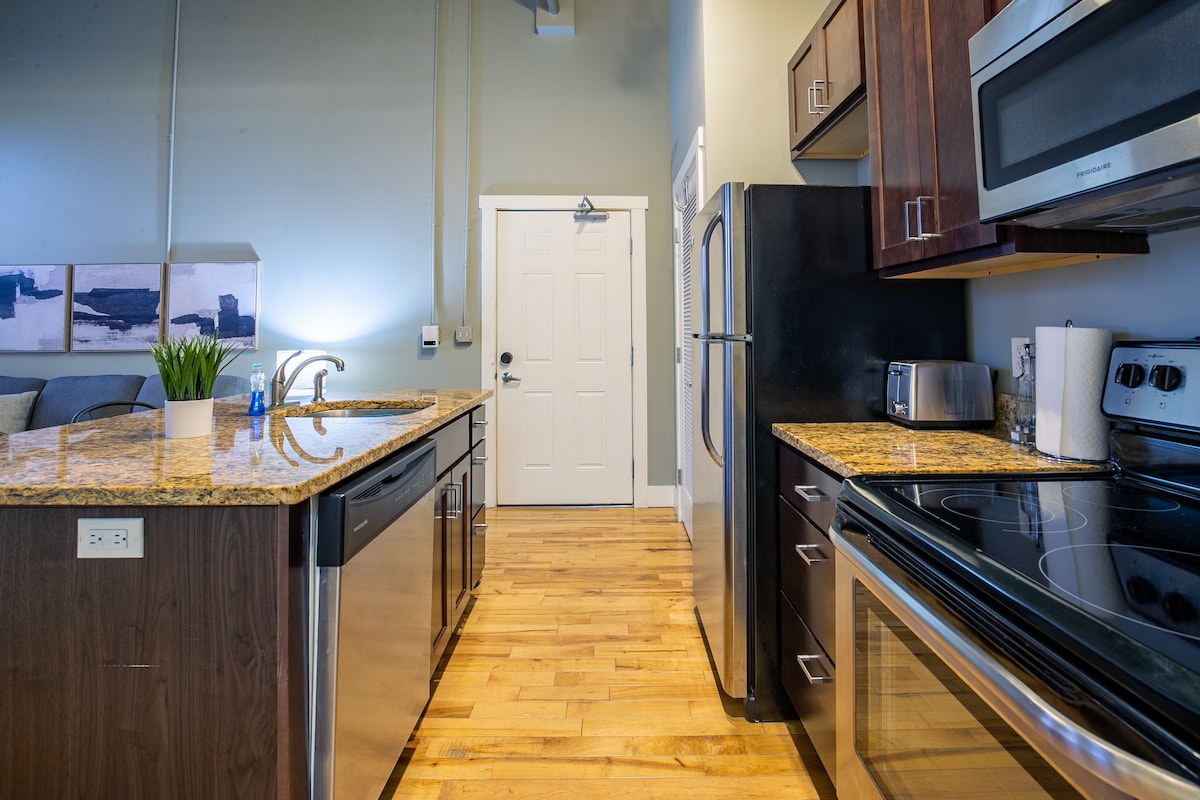 This historic 1890 loft was reimagined for modern living. The birth home of billionaire Jay Van Andel, it sits above the best breakfast spot in Grand Rapids (The Cherie Inn) and in the heart of East Hills’ vibrant shops and restaurants—aka the Center of the Universe. Shuffleboard, Xbox and multiple smart TV’s for additional entertainment if necessary. The fastest internet available in the area (1.2 gig and wifi6). The best spot in GR for a getaway.