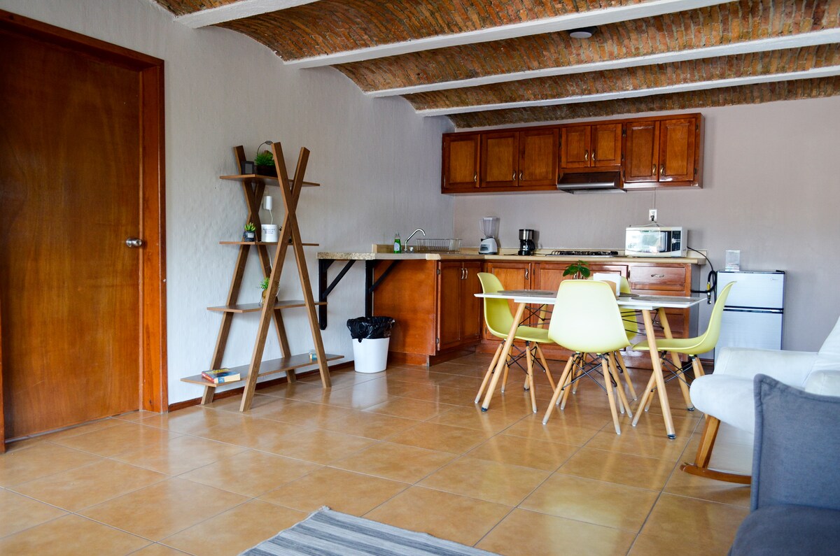 Enjoy simplicity and comfort in this quiet and elegant space; it has a Minisplit, dining room, kitchenette, stove, refrigerator and a fully independent bathroom. Free Wifi.