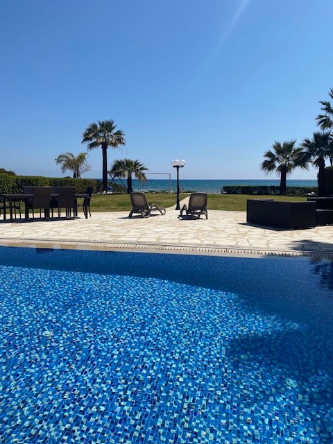 Fabulous one bedroom apartment, right on the beach, with undisrupted seafront views. It's close to watersport facilities, Cyprus Tourism beach, hotels and restaurants. A great way to start your day by waking up to the amazing clear blue waters view. Nice sandy beaches. You'll also find it very convenient as it's approx a 15min drive to the airport, 20min to Ayia Napa, 30min to Nicosia and under an hour to Limassol!